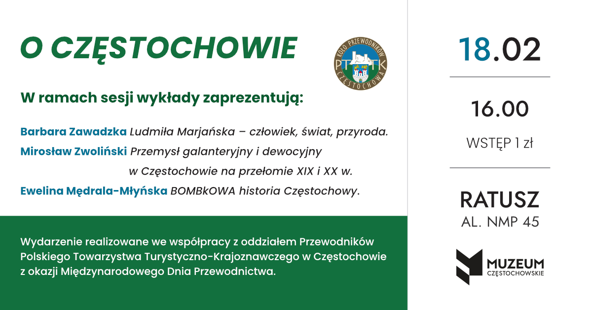 W środę, 18 lutego 2026 roku o godzinie 16:00 w Ratuszu odbędzie się sesja O Częstochowie zorganizowana z okazji Międzynarodowego Dnia Przewodnictwa. Wykłady zaprezentują: Barbara Zawadzka Ludmiła Marjańska – człowiek, świat, przyroda; Mirosław Zwoliński Przemysł galanteryjny i dewocyjny w Częstochowie na przełomie XIX i XX w.; Ewelina Mędrala-Młyńska BOMBkOWA historia Częstochowy. Wydarzenie realizowane we współpracy z oddziałem Przewodników Polskiego Towarzystwa Turystyczno-Krajoznawczego w Częstochowie. Wstęp 1 zł | |