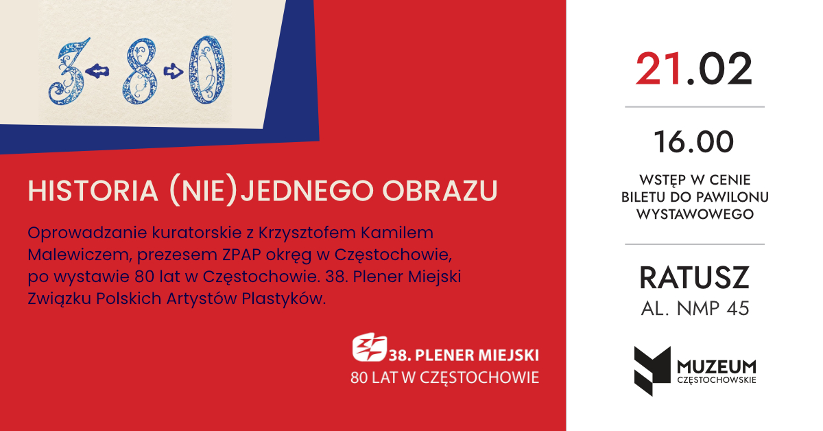 Na oprowadzanie kuratorskie z Krzysztofem Kamilem Malewiczem, prezesem ZPAP okręg w Częstochowie, po wystawie "80 lat w Częstochowie. 38. Plener Miejski Związku Polskich Artystów Plastyków" Muzeum Częstochowskie zaprasza 21 lutego 2026 roku o godzinie 16:00 do Pawilonu Wystawowego w Parku Staszica. Na ekspozycji prezentowana jest twórczość artystów należących do ZPAP Okręgu w Częstochowie. W 2026 r. przypada 115. rocznica powstania Związku Polskich Artystów Plastyków – najstarszego stowarzyszenia zrzeszającego profesjonalnych twórców w Polsce. Dla częstochowskiego Okręgu ZPAP jest to jednocześnie jubileusz 80-lecia działalności. Należy z dumą podkreślić, że mimo wielu wyzwań obecność stowarzyszenia na kulturalnej mapie Częstochowy pozostaje wyrazista i nieprzerwana. Wstęp w cenie biletu do obiektu. |