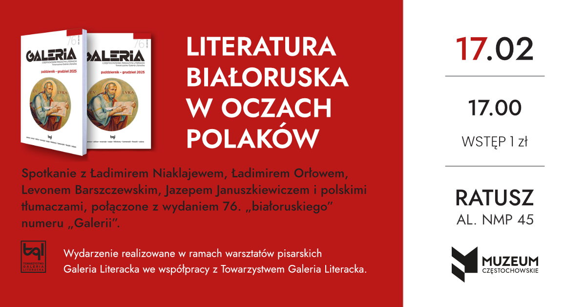 Wyjątkowo we wtorek, 17 lutego 2026 roku o godzinie 17:00 w Ratuszu odbędzie się Galeria Literacka. Tym razem zapraszamy na spotkanie z Ładimirem Niaklajewem, Ładimirem Orłowem, Levonem Barszczewskim, Jazepem Januszkiewiczem i polskimi tłumaczami, połączone z wydaniem 76. „białoruskiego” numeru Galerii. Rozmowę z udziałem gości z Białorusi oraz polskich tłumaczy Bohdana Zadury i Bogdana Knopa poprowadzą Barbara Strzelbicka i Olga Wiewióra. Z krótkim recitalem wystąpi Tomasz Plaskacz. Wydarzenie realizowane jest w ramach warsztatów pisarskich Galeria Literacka we współpracy z Towarzystwem Galeria Literacka. Wstęp 1 zł | |